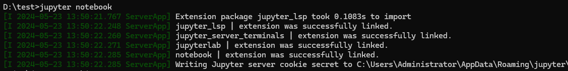 cmd에서 먼저 작업할 공간으로 이동 후 다음 명령어로 Jupyter Notebook을 실행합니다. 예시에서는 D 드라이브에 test 폴더를 생성하고 진행했습니다.